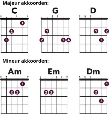 Hieronder zie je een voorbeeld van verschillende veelgebruikte akkoorden.
