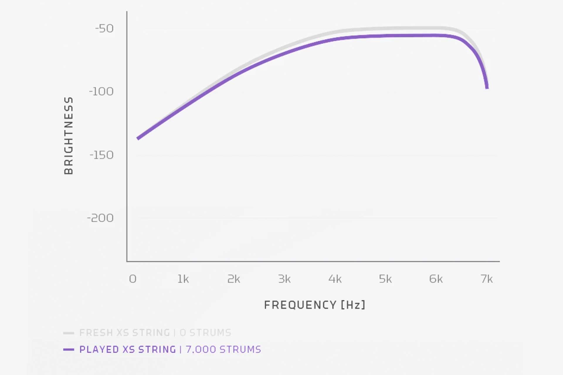Nieuwe snaren klinken altijd goed. Het probleem is dat dat vaak maar van korte duur is. Bij de XS bassnaren is dat precies waar ze het verschil maken. In de grafiek zie je dat een nieuwe XS bassnaar en een XS bassnaar die al flink bespeeld is (7000 strums) bijna hetzelfde presteren. De helderheid blijft, ook na duizenden aanslagen.