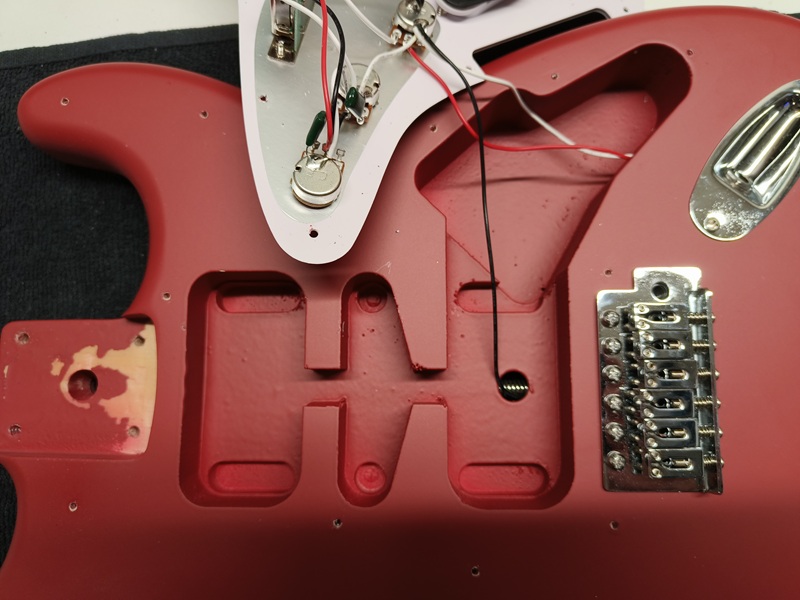 Soms worden de holtes in de body van een Strat met geleidende verf ingestreken. Dit gebeurt om zoveel mogelijk een soort kooi van Faraday te creëren, zodat er minder stoorsignalen in de body terechtkomen.