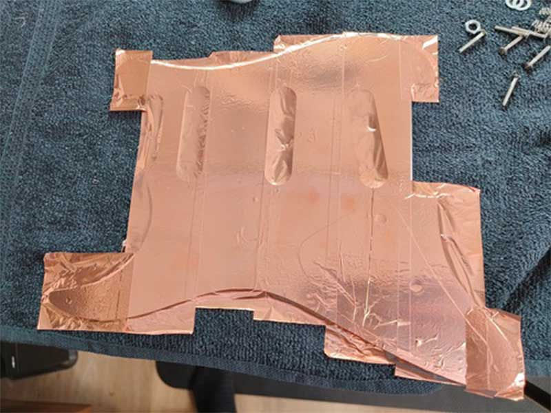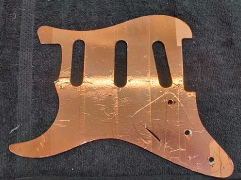Het aanbrengen van afscherming is iets wat makkelijk zelf te doen is, je zult alleen (om het je zelf makkelijk te maken) de elektronica op de pickguard los moeten maken. Van daaruit kun je dan de gehele pickguard met koperfolie bedekken (zie afbeelding) .