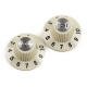Set van twee kunststof knoppen gebruikt op '65 Jazzmaster gitaar. Deze volumeknoppen passen op de meeste vintage en moderne Jazzmaster gitaren. De verpakking bestaat uit twee knoppen. Deze knoppen passen op 1/4” solid shaft potmeters.