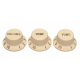 Set van drie Fender oudwitte plastic knoppen voor de Fender Stratocaster. Deze volumeknoppen passen op 1/4" split-shaft (fine) potentiometers en de meeste in de VS en Mexico modellen Stratocaster gitaren vervaardigd vanaf 1951 tot heden. De verpakking bestaat uit drie knoppen: twee tone knoppen en één volumeknop.