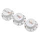 Set van drie Fender witte plastic knoppen voor de Fender Stratocaster. Deze volumeknoppen passen op 1/4" split-shaft (fine) potentiometers en de meeste in de VS en Mexico modellen Stratocaster gitaren vervaardigd vanaf 1951 tot heden. De verpakking bestaat uit drie knoppen: twee tone knoppen en één volumeknop.